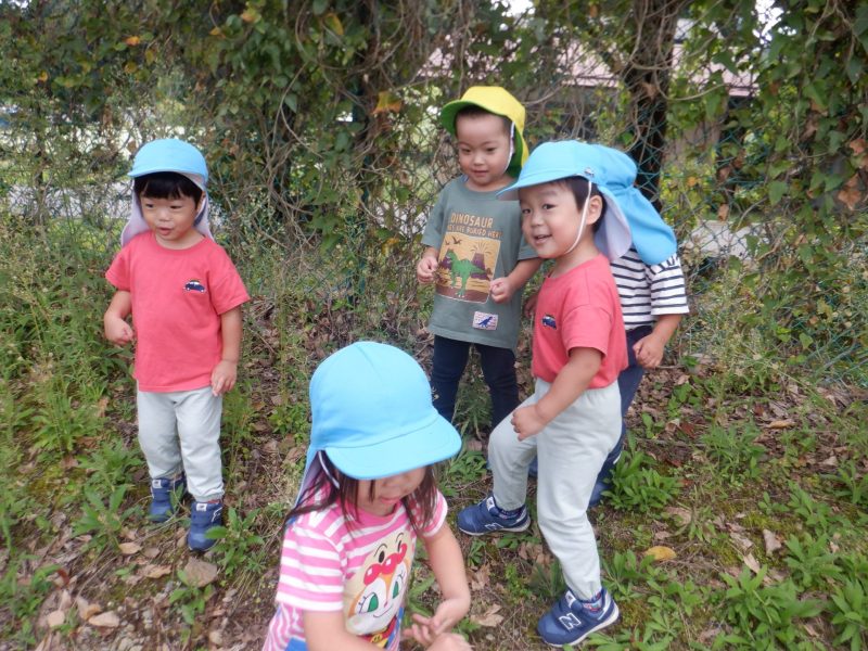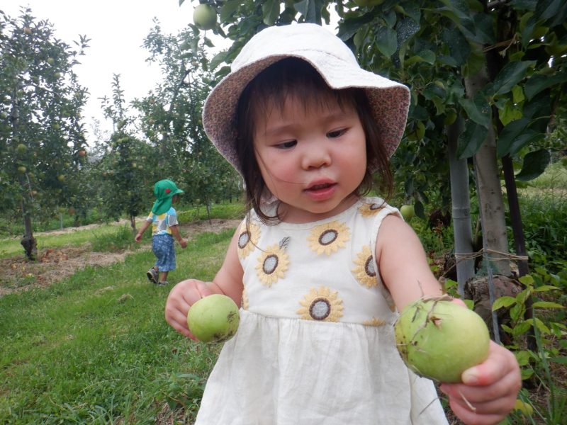 おお散歩途中に落ちている赤ちゃんリンゴ発見!大きくて赤いリンゴになるのが楽しみだね。