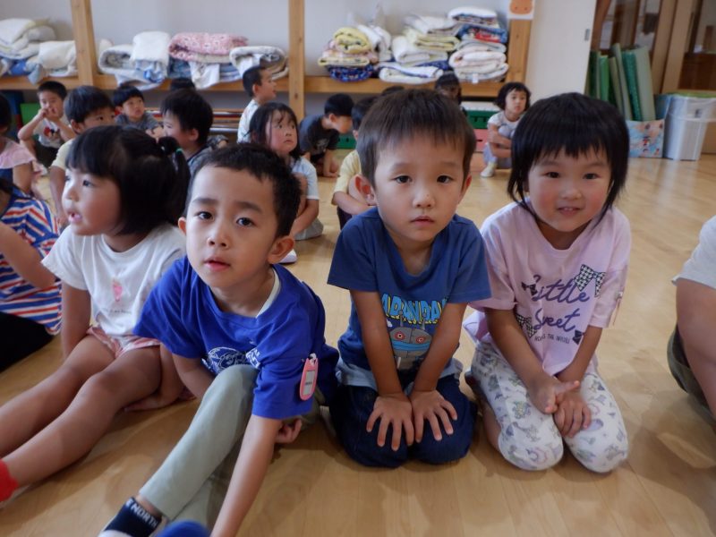 「今月の誕生会は誰が誕生日かな~?」上手に座って待てるようになりました。